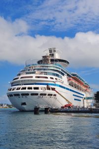 Cruise ship park at Miami dock with cloud and blue sky.
